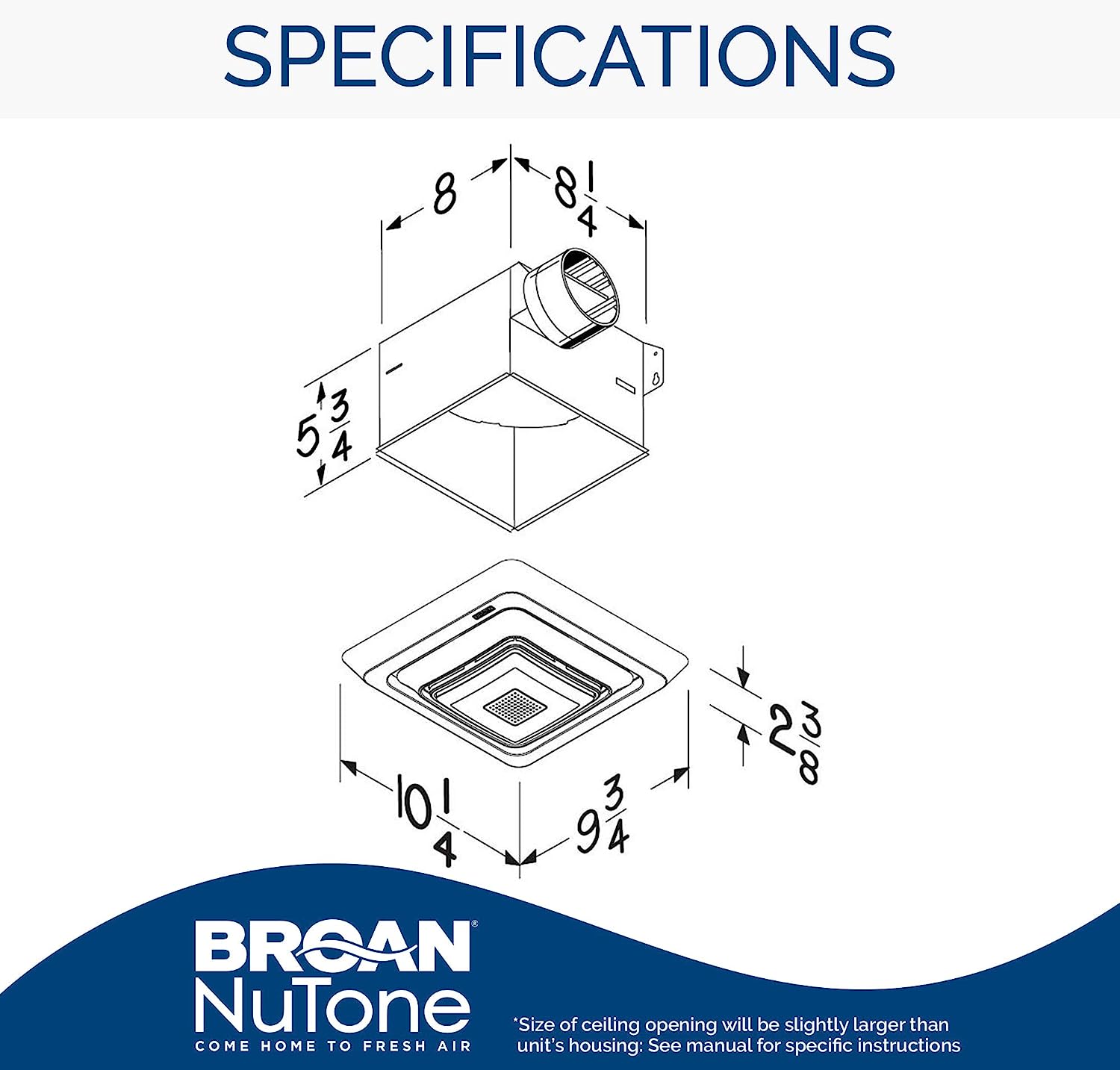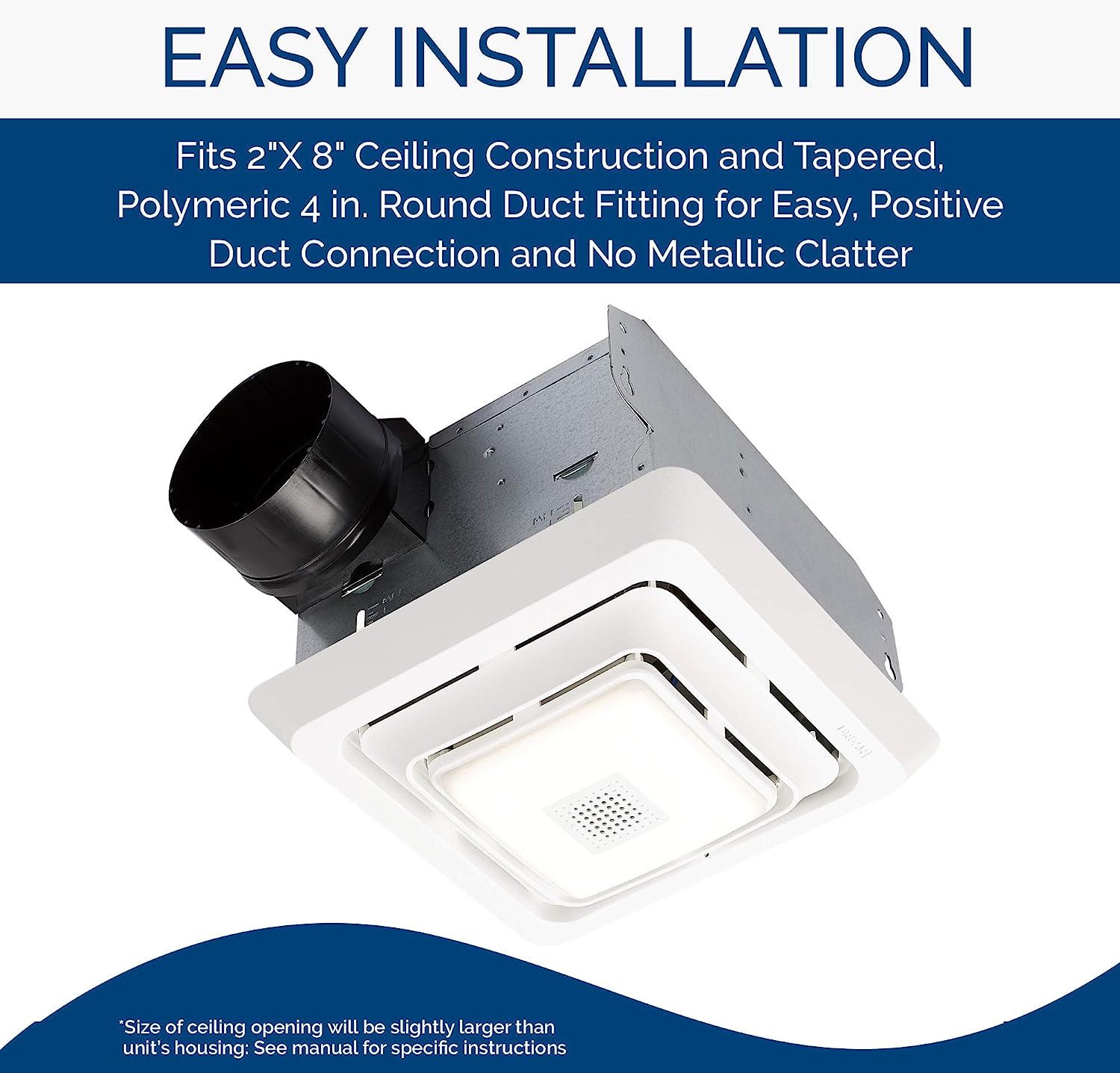 - Easy-to-install fan fits 2″x 8″ ceiling construction and tapered, polymeric 4 in. round duct fitting for easy, positive duct connection and no metallic clatter