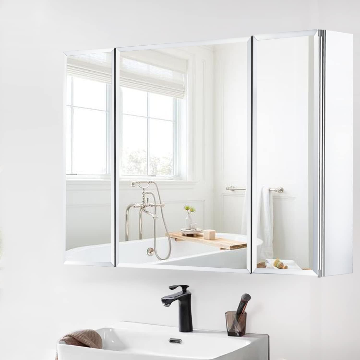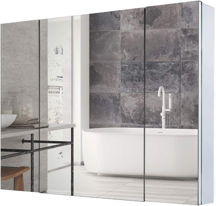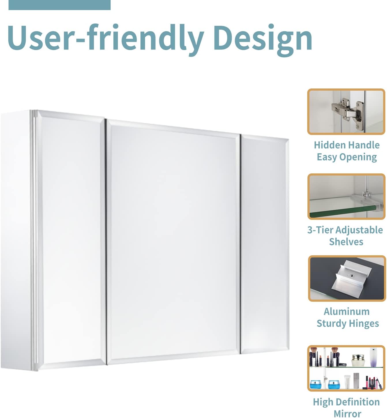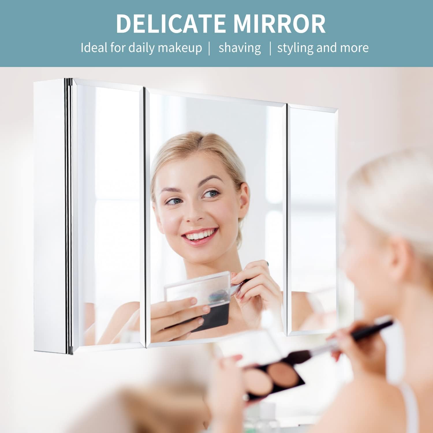 - [WELL-DESIGNED] Two-way hinges with 108-degree opening capability and a hidden handle for easy cabinet access. The wall-mount medicine cabinet with high-definition mirrors on the front and back of the single door gives you a perfect experience for make-up or shaving.