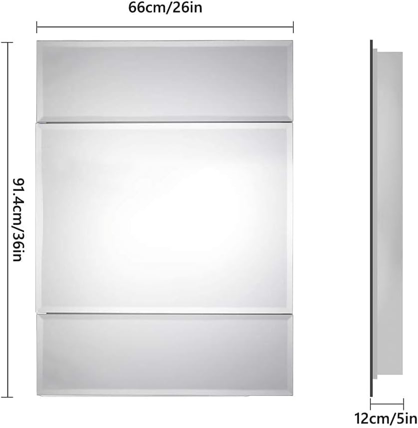 - [SURFACE OR RECESSED INSTALLATION] Support wall mount and recessed mount. The size of a frameless wall cabinet is 36” (W) Inch X 26” (H) X 5” (D), and the Rough Wall Opening is 36-1/4 in(W) X 25-5/16 in. (H) X 3-7/8 in. (D) The mirror cabinet can be perfectly used in the kitchen, bedroom, living room, and small space to organized your sundries and other objects.